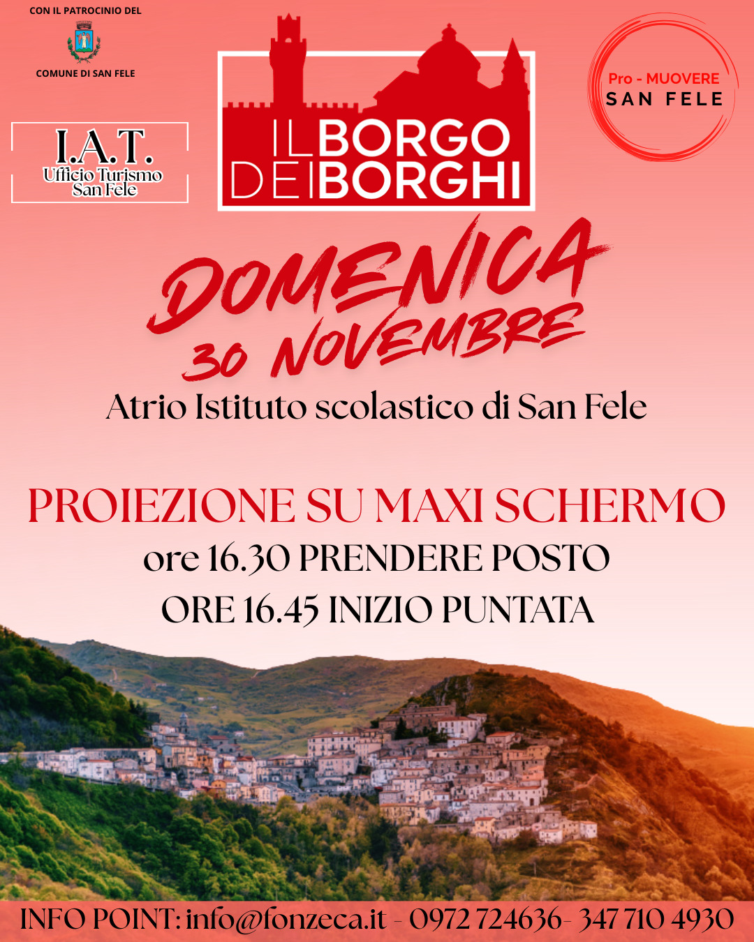 Avviso Pubblico 29/11/2025 Domenica 30 novembre, dalle ore 16.30, presso l'atrio dell'Istituto scolastico "G. Faggella" sarà proiettata su maxi schermo la trasmissione "Il Borgo dei Borghi" che vedrà protagonista San Fele Continua a leggere